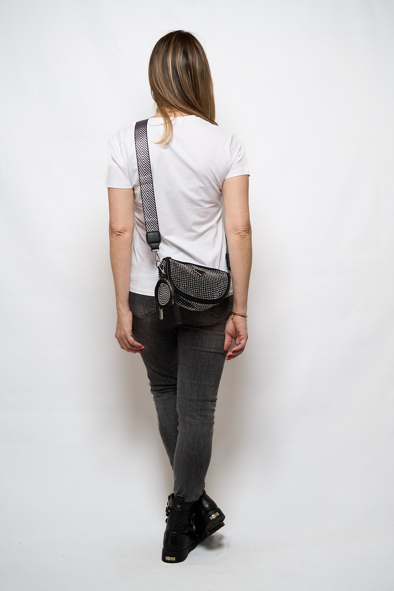 ndtasche "Strasssteine" Schwarz / Silber mit Strasssteinen bestückt. Schulterbändel aus Stoff